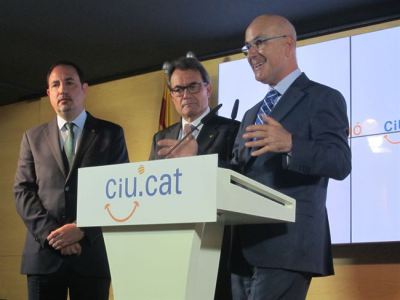 Duran ha comparecido flanqueado por el presidente de la Generalitat, el alcalde de Barcelona y secretario general adjunto de la federación, Xavier Trias, y del que será su sucesor como secretario general de CiU, el conseller de Interior, Ramon Espadaler.